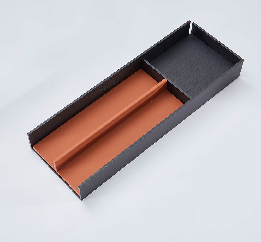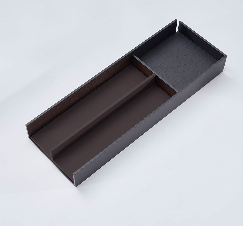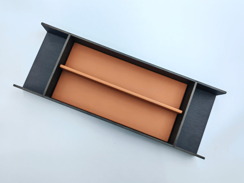 All handcrafted, the eco-leather RM-13 Divider 2C insert is designed to be nested into the  RM-1 Universal Tray for robust protection and definition. The appearance of the eco-leather insert framed by the Compact HPL wood grained tray is so chic!