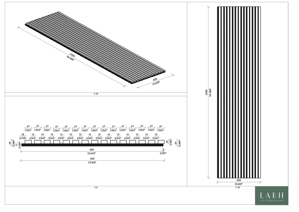 Panels are 23.6" wide and come in two lengths - 94.5" and 118.1". The slats are backed with 0.38” PET felt that reduces echoes and dampens sound, all while being made with 100% recyclable materials.