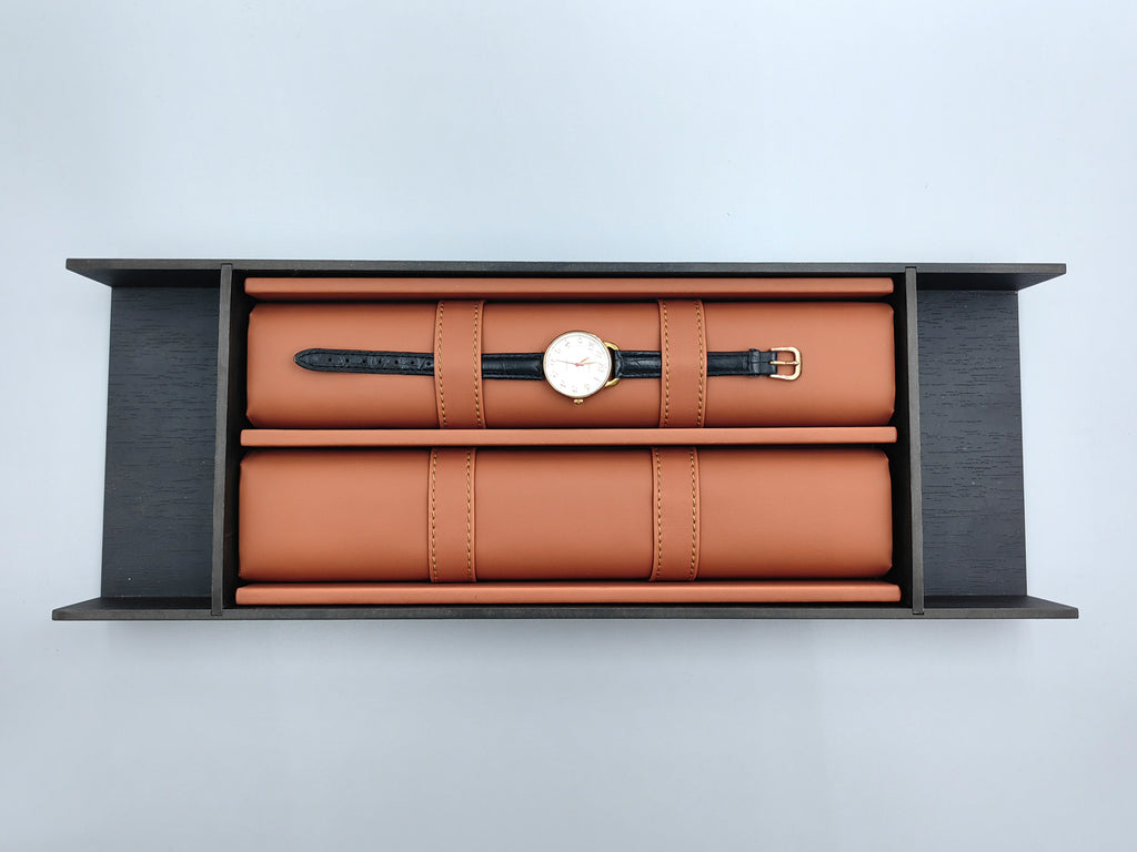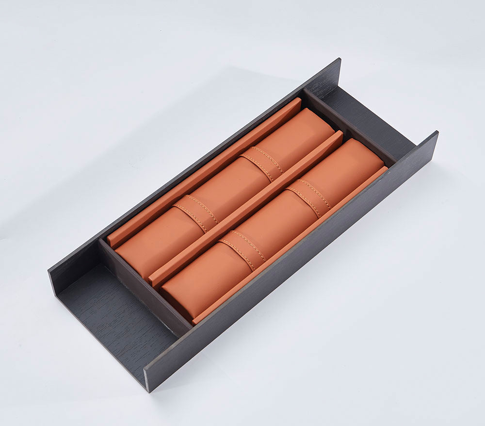 All handcrafted, the eco-leather RM-5 Watch Flat insert is designed to be nested into the RM-1 Universal Tray for robust protection and definition. The appearance of the eco-leather insert framed by the Compact HPL wood grained tray is so chic!